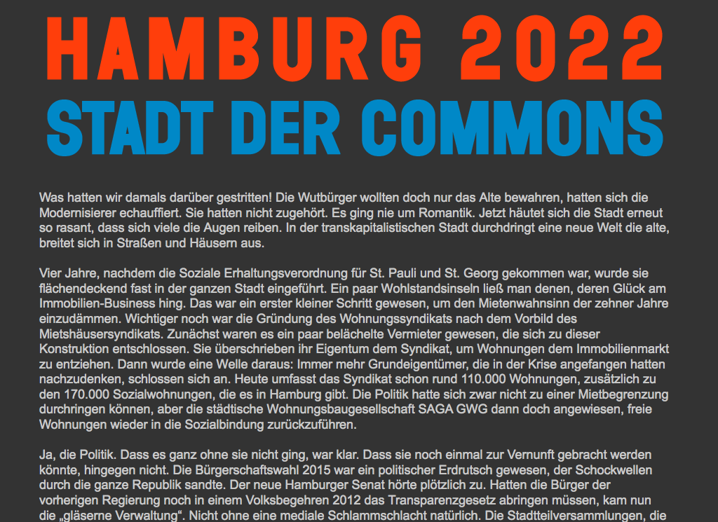 "Wir sind die Stadt" diese Parole hat noch weitere Früchte getragen. Der neue Senat überführte sämtliche städtischen Immobilien und die auf Grund von Leerstand zwangsenteigneten ehemaligen Bürogebäude in die neu geschaffenen "Hamburg Commons": städtisches Gemeineigentum, dessen Nutzung durch eine gemeinsame Kommission aus allen Stadtteilversammlungen verwaltet wird. In den neuen Gemeinschafts-Immobilien ist überall im Stadtgebiet eine "Graswurzel-Ökonomie" entstanden. Es wird wieder produziert - mitten in der Stadt. Produktionscommunities gibt es selbst in Mümmelmannsberg und Steilshoop, die viel zu lange im Windschatten der Auseinandersetzung um die Innenstadt gelegen hatten. Sie sind mit Communities in anderen Städten und weltweit vernetzt und stellen sich die neuesten Konstruktionspläne als "Open Design" wechselseitig zur Verfügung. Sie produzieren vor allem das, was die Leute selbst brauchen nur ein kleinerer Teil der Fabrikate gelangt auf den Markt. Zur städtischen Wertschöpfung der Stadt tragen sie nach wenigen Jahren indirekt bereits fünf Prozent bei fast halb soviel wie der Hafen.