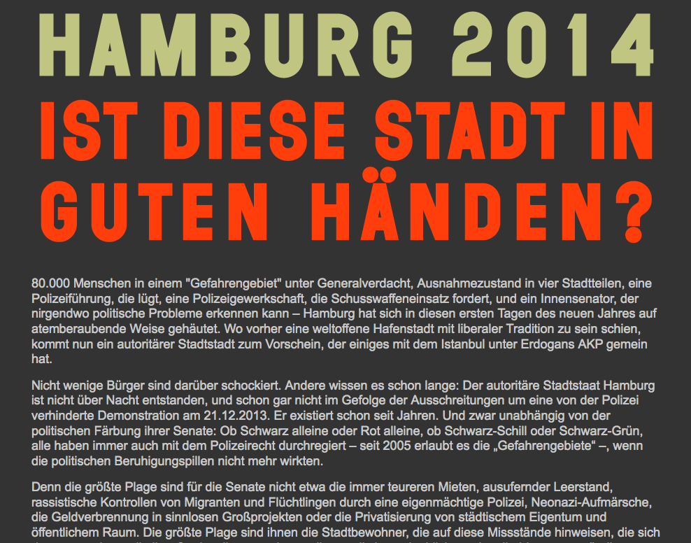 80.000 Menschen in einem "Gefahrengebiet" unter Generalverdacht, Ausnahmezustand in vier Stadtteilen, eine Polizeiführung, die lügt, eine Polizeigewerkschaft, die Schusswaffeneinsatz fordert, und ein Innensenator, der nirgendwo politische Probleme erkennen kann Hamburg hat sich in diesen ersten Tagen des neuen Jahres auf atemberaubende Weise gehäutet. Wo vorher eine weltoffene Hafenstadt mit liberaler Tradition zu sein schien, kommt nun ein autoritärer Stadtstadt zum Vorschein, der einiges mit dem Istanbul unter Erdogans AKP gemein hat. Nicht wenige Bürger sind darüber schockiert. Andere wissen es schon lange: Der autoritäre Stadtstaat Hamburg ist nicht über Nacht entstanden, und schon gar nicht im Gefolge der Ausschreitungen um eine von der Polizei verhinderte Demonstration am 21.12.2013. Er existiert schon seit Jahren. Und zwar unabhängig von der politischen Färbung ihrer Senate: Ob Schwarz alleine oder Rot alleine, ob Schwarz-Schill oder Schwarz-Grün, alle haben immer auch mit dem Polizeirecht durchregiert seit 2005 erlaubt es die Gefahrengebiete , wenn die politischen Beruhigungspillen nicht mehr wirkten. Denn die größte Plage sind für die Senate nicht etwa die immer teureren Mieten, ausufernder Leerstand, rassistische Kontrollen von Migranten und Flüchtlingen durch eine eigenmächtige Polizei, Neonazi-Aufmärsche, die Geldverbrennung in sinnlosen Großprojekten oder die Privatisierung von städtischem Eigentum und öffentlichem Raum. Die größte Plage sind ihnen die Stadtbewohner, die auf diese Missstände hinweisen, die sich dagegen wehren, die ihre Stadt selbst gestalten wollen, weil sie unglaublicherweise die Idee vom mündigen Bürger ernst genommen haben, weil sie sich als freie Menschen betrachten. Für eine politische Klasse, die seit 30 Jahren die Stadt als Unternehmen im Konkurrenzkampf um Kapital, Leistungsträger, Touristen und Imagepunkte betrachtet, geht so viel zivilgesellschaftlicher Eigensinn gar nicht. Keine Konzernführung lässt sich schließlich von seinen Fabrik- und Lagerarbeitern in die Unternehmensstrategie reinreden. Die sieht für Hamburg vor, Stadtteile zu Business Units umzubauen: St. Pauli wird zum durchgestylten Entertainment-Park; Wilhelmsburg zur Erlebnis-Ausstellung für ein Schöner-Wohnen in einer Flusslandschaft; Altona zu IKEA-Town und damit zum Brückenkopf eines Global Player, der begonnen hat, ganze Stadtteile selbst zu bauen wenn auch vorerst nur in Frankreich und in Großbritannien. In so einer Stadt sind natürlich keine Flüchtlinge willkommen, die es aus den Elendsquartieren und Kriegsgebieten am Rande der Festung Europa hierher geschafft haben, weil sie für das Unternehmen Stadt keinen Mehrwert mitbringen. Also verwahrt es die Flüchtlinge in Containern und regelrechten Internierungslagern, bis es sie wieder in Drittstaaten abschieben kann. Die derzeit modernste Flüchtlingspolitik in Deutschland sieht der Erste Bürgermeister darin derselbe Mann, der schon 2001 den Brechmitteleinsatz gegen mutmaßliche Dealer modern fand. Die vermutete die Polizei damals zuerst unter Menschen afrikanischer Herkunft. Auch Racial Profiling hat in Hamburg Tradition. Der Erste Bürgermeister und sein Senat sind zudem mit einer erstaunlichen Machtfülle ausgestattet, die sie den Nazis verdanken. Im Großhamburg-Gesetz von 1937 wurde Hamburg zur Einheitsgemeinde. Das bedeutet: Die Bezirke sind keine eigenständigen Kommunen, und wenn dort die Bewohner mit einem Bürgerbegehren der Politik einen Strich durch die Rechnung machen, kann der Senat die Entscheidung der Bewohner für null und nichtig erklären. Das tut er regelmäßig, auch hier unabhängig von der politischen Färbung des Senats. Wenn es darum geht, soziale und städtebauliche Missstände anzugehen, muss man den Senat und seine bezirklichen Handlanger jedoch zum Jagen tragen. Eigentümer lassen Häuser verfallen, bis sie abbruchreif sind? Da kann man nichts ändern, die Gesetzeslage lässt keinen Handlungsspielraum zu, heißt es. Die Mieten steigen und steigen? Da kann man nichts ändern, die Gesetzeslage lässt keinen Handlungsspielraum zu, heißt es. Auch beim Bleiberecht für Flüchtlinge nicht. Bei neuen Befugnissen für die Polizei hingegen ist erstaunliche gesetzgeberische Kreativität zu erkennen, da geht eine Menge. Die eingangs gestellte Frage ist längst beantwortet: Eine Stadt, in der mit dem Polizeirecht regiert wird, ist nicht in guten Händen. Eine Stadt, in der über 80.000 Menschen der Ausnahmezustand verhängt wird, ist nicht in guten Händen. Eine Stadt, in der Flüchtlinge interniert und abgeschoben werden, ist nicht in guten Händen. Eine Stadt, in der Leerstand in Ordnung ist, Besetzungen von Leerstand hingegen kriminalisiert werden, ist nicht in guten Händen. Eine Stadt, die von ihrem politischen Personal als Konzern geführt wird, ist nicht in guten Händen. Eine Stadt, in der Bewohner nur zu verwaltende Objekte in der Konzernstrategie sind und nichts zu sagen haben, ist nicht in guten Händen. Kurz gesagt: Hamburg ist nicht in guten Händen. Und daran wird sich auch nichts ändern, wenn bei der nächsten Wahl der Senat eine andere Farbe bekommt. Ein Rücktritt der Hardliner Neumann, Kopitzsch und Born ist zwar dringend nötig, aber wir sollten uns keine Illusionen machen: Der Saustall des autoritären politischen Systems in Hamburg ist auch mit sämtlichen Klobürsten aus dem Gefahrengebiet nicht mehr auszumisten. Es muss ganz anders werden. Hamburg gehört in die Hände seiner Bewohnerinnen. Hamburg muss überhaupt erst einmal eine demokratische Stadt werden, und eine Stadt, die sich das Etikett weltoffen noch verdienen muss. Das Recht auf Stadt muss für alle gelten, ohne Grenzen, ohne Einschränkungen. Solange dies nicht der Fall ist, wird in Hamburg keine Ruhe mehr einkehren. |